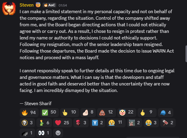Позволю себе лишь кратко высказаться лично, а не от лица студии. Я утратил контроль над компанией, и совет директоров стал принимать решения, противоречащие моим этическим принципам. В знак протеста я подал в отставку, отказавшись связывать своё имя или авторитет с решениями, которые я не мог этически поддержать. После моего ухода компанию покинула большая часть руководителей. Затем совет директоров, действуя в соответствии с законом о предупреждении о сокращении штата и переподготовке работников, санкционировал массовые увольнения.